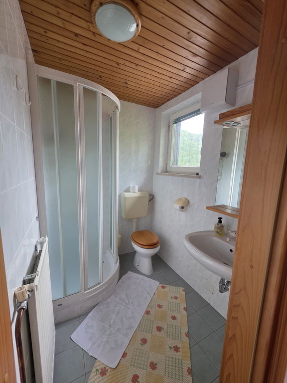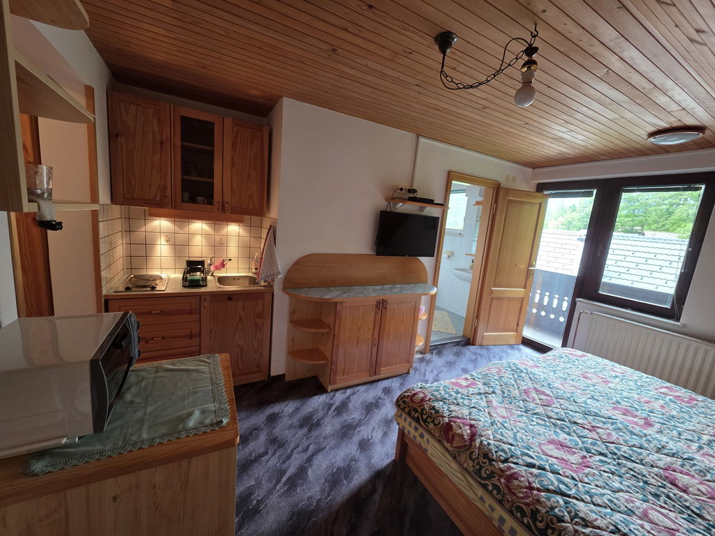 Kopalnica s tušem (2,6m2) ter soba (13,6m2) z manjšim predprostorom, kuhinjo, jedilnico in posteljo z izhodom na balkon 4,7m2 (ima stranski pogled na jezero).